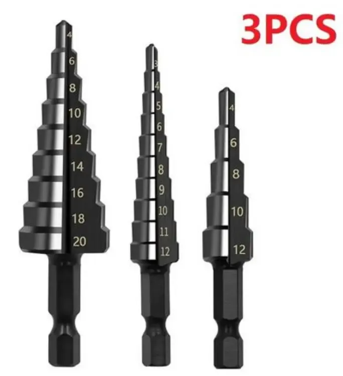Кожне свердло має нанесену нумерацію, що значно полегшує контроль розміру отвору під час свердління. У комплект входять східчасті свердла: 4-12мм, 3-12мм, 4-20мм