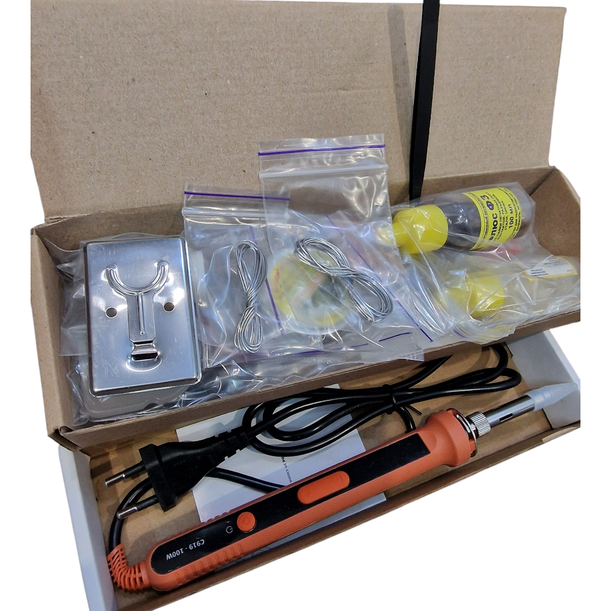 в комлект входить паяльник 100ват,олово польське 2шт ,каніфоль,набір мідних жал, паста паяльна, кислота паяльна, флюс ф3, флюс гелевий по алюмінію, підставка міні , пінцет.